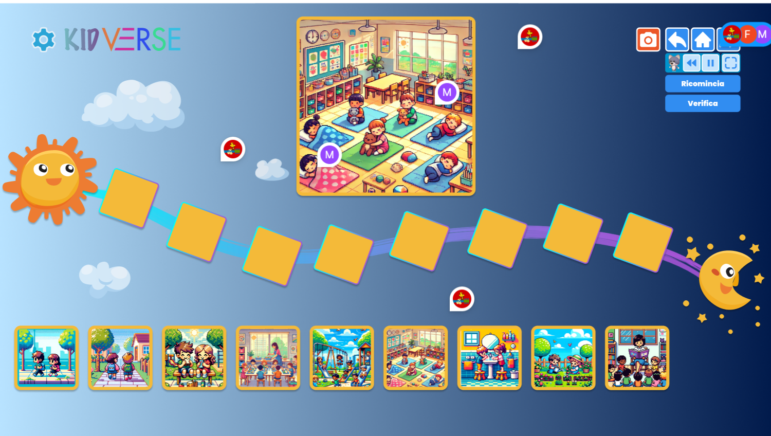 - Kidverse: an immersive learning experience for kindergarteners for which I developed educational games structured around the fields of experience and expertise goals promoted by the Italian Ministry of Education.